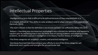 The document explores the complexities of intelligence, giftedness, and intellectual disability, noting various definitions and theories from psychologists such as Sternberg and Gardner. It discusses the limitations of IQ tests in measuring intelligence and the different factors influencing their accuracy, while also categorizing giftedness and intellectual disabilities. Key points include the multi-faceted nature of intelligence, emotional intelligence, and the classification of intellectual disabilities into mild, moderate, severe, and profound.