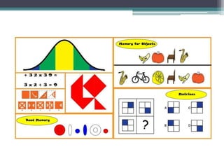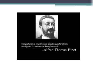 This document provides information about intelligence tests. It defines intelligence and discusses key figures in the development of intelligence testing like Alfred Binet and Theodore Simon who created the first intelligence test. It describes different types of intelligence tests including individual verbal tests like the Stanford-Binet test, individual non-verbal tests involving tasks like block building, and group tests with verbal and non-verbal components. The document also discusses intelligence quotients (IQ) and classifications of IQ scores.
