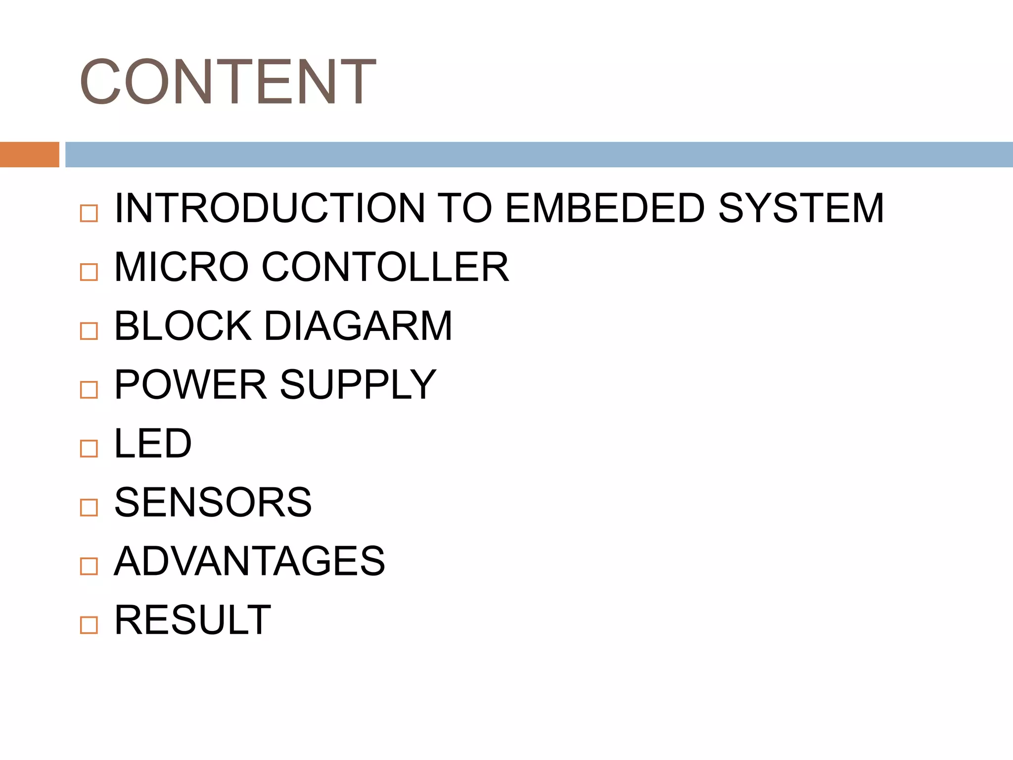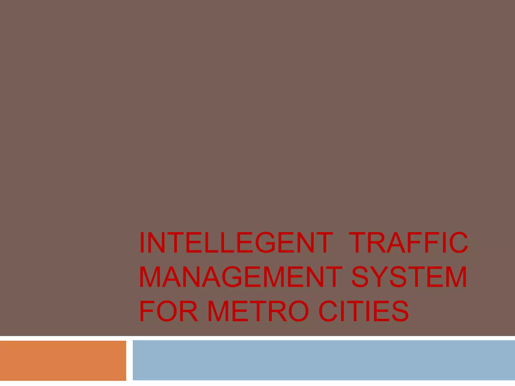 This document describes an intelligent traffic management system for metro cities using an embedded system with a microcontroller. It includes sections on the embedded system concept, the AT89C52 microcontroller used, a block diagram of the system components including the microcontroller, power supply, LED lights, IR sensors, and advantages like increased traffic handling and reduced collisions. It aims to efficiently manage traffic flow and reduce issues like fuel consumption, pollution, and driver frustration.