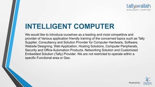 Intelligent Computer introduces itself as a leading provider of various application and computer training, consultancy, and solutions. It offers services including Tally implementation, business advisory, corporate training, and ERP implementation. It provides solutions such as Tally customization and integration, Tally on cloud, thin clients, access control systems, data backup systems, network access storage, and data security products. The company aims to provide top notch service to over 200 satisfied customers through its 24/7 support system and experienced team.