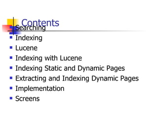 This document discusses using Lucene to index both static and dynamic web pages. It describes parsing Apache web server logs to extract parameters for dynamic pages and generate URLs. These URLs are then used to fetch results pages, which are analyzed and indexed. The indexing process is implemented in a Java program that reads logs, generates URLs, and uses Lucene to extract text and build an index from the dynamic content. A demo shows searching the index from both a command prompt and web interface. Lucene provides powerful yet easy to use search capabilities and can index dynamic pages not normally accessible to search engines.