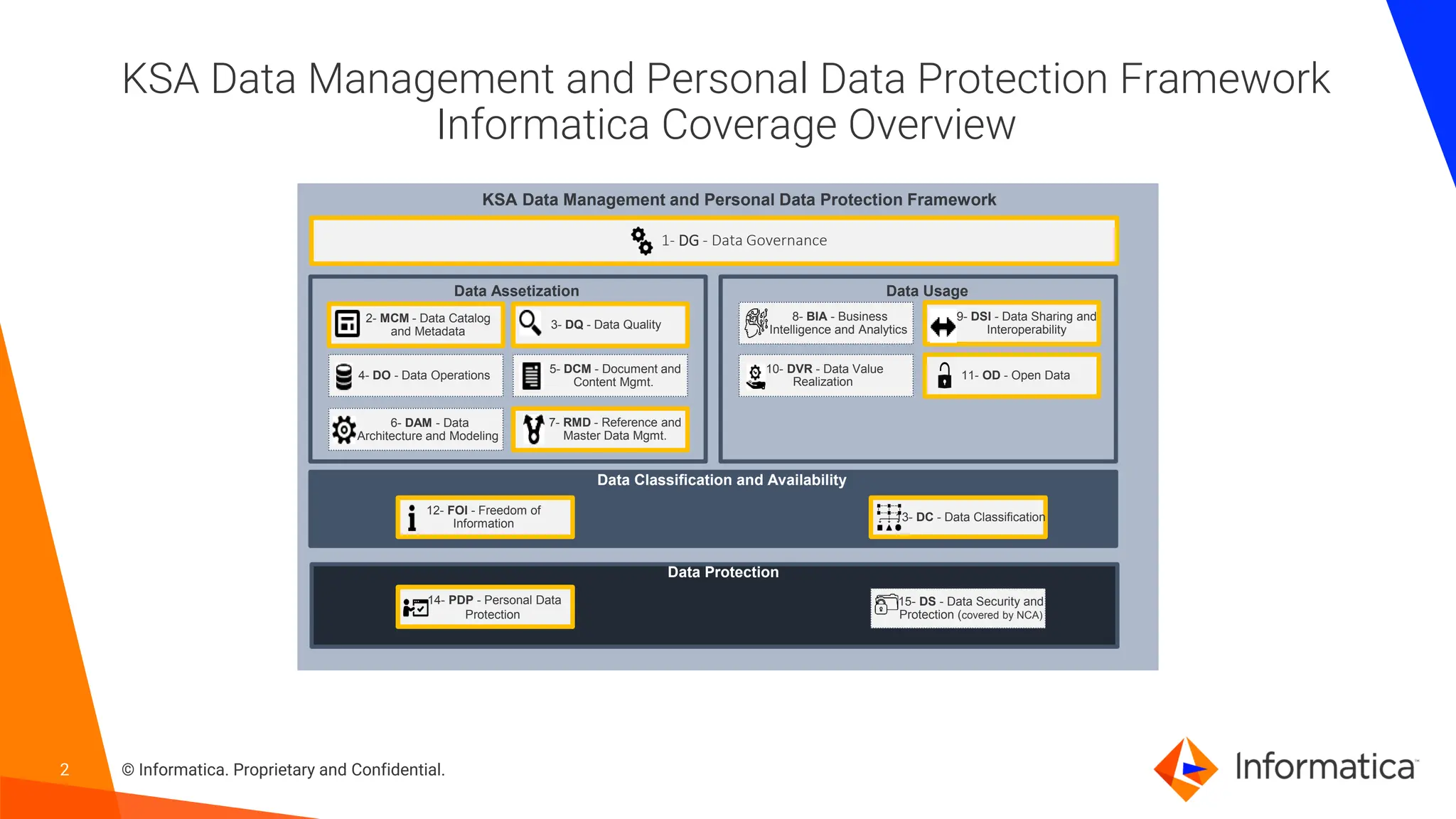 The document outlines Informatica's KSA data management and personal data protection framework, emphasizing data governance, classification, and the use of an intelligent data management platform powered by AI and machine learning. It discusses the roles of various stakeholders, data stewardship, and the integration of metadata management tools like EDC and Axon to enhance data quality and governance. Key features include automated data discovery, metadata management, and performance tracking to support data-driven transformation and business value optimization.