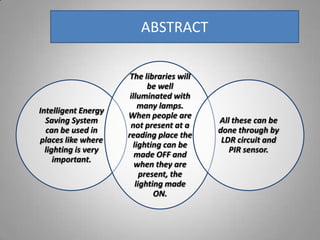The document describes an intelligent energy-saving system designed to control lighting in places like libraries using a combination of PIR sensors, an ATmega8L microcontroller, and LDRs. The system detects human presence and adjusts the lighting accordingly, turning it off when no one is present and on when someone enters the area. It outlines the components, operational principles, and programming logic necessary for the implementation of the system.