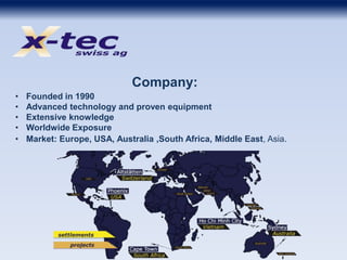 X-Tec Swiss AG is an international supplier of concrete plants, heating and cooling systems founded in 1990. It has a worldwide market presence and offers modular, economical plants tailored to customer requirements. Notable past projects include works for Holcim, Leighton Contractors, and airports in Dubai and Germany. X-Tec's product lines include stationary tower, horizontal, and mobile concrete plants, as well as pre-casting systems. It innovates with technologies like an automatic rheological probe for real-time concrete monitoring and has goals of constant improvement, innovation, safety, and customer satisfaction.