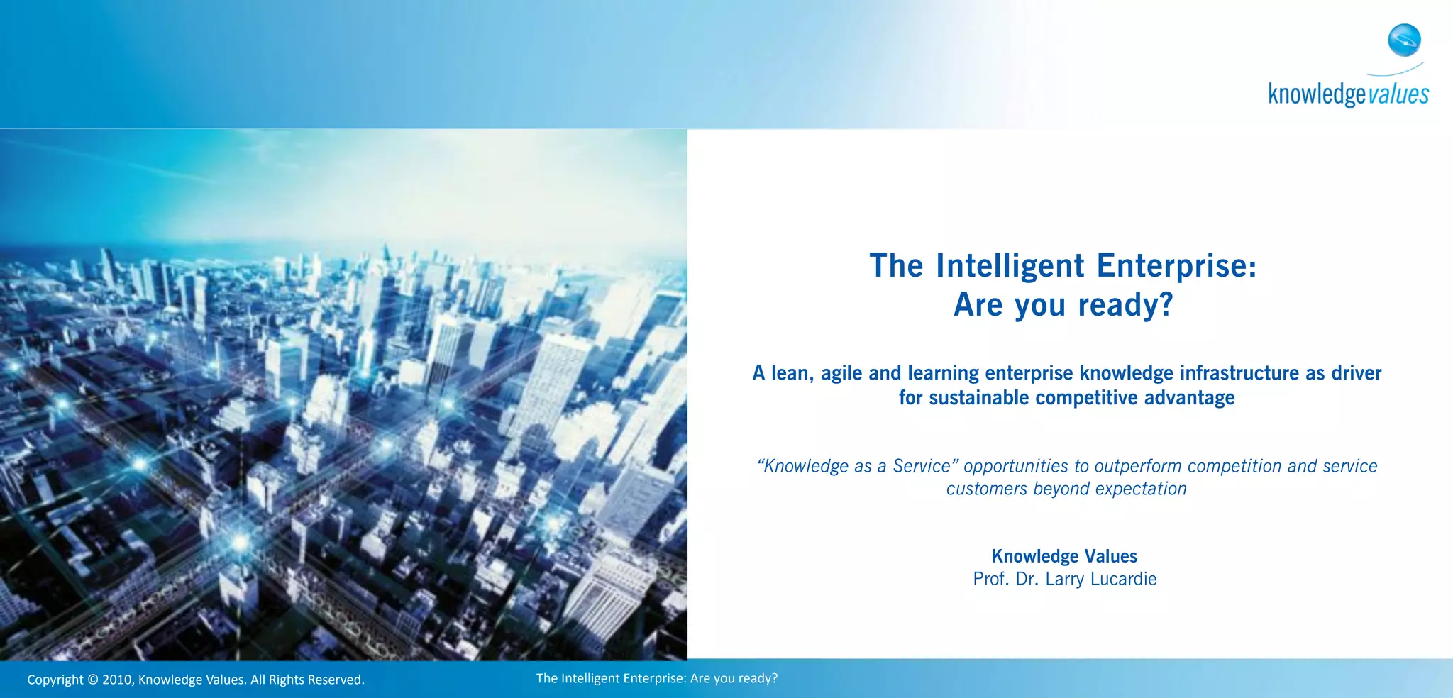 The document discusses the need for enterprises to transform into intelligent enterprises in order to succeed in today's knowledge economy. It advocates for implementing a lean, agile and learning knowledge infrastructure using Advanced Knowledge Services and Match Knowledge Technology. This would allow enterprises to share knowledge more effectively, optimize processes, reduce costs and better serve customers. The Match Knowledge Technology is presented as enabling rapid application development without hard coding by using executable requirements and modeling the enterprise's knowledge base.