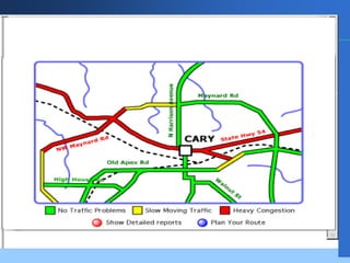 This document discusses intelligent highways and future traffic tracking technologies. It begins with an introduction to intelligent highway systems, which use added intelligence on roads and vehicles to decrease congestion and accidents without building new highways. It then discusses the need for such systems due to traffic, costs of accidents, and time lost in traffic. Current traditional methods of loop detectors, video cameras, and electronic sign boards are overviewed. The document outlines how future traffic tracking would work using electronic devices in vehicles communicating with listening posts to triangulate locations, as well as technologies like E-Z Pass electronic toll collection tags.