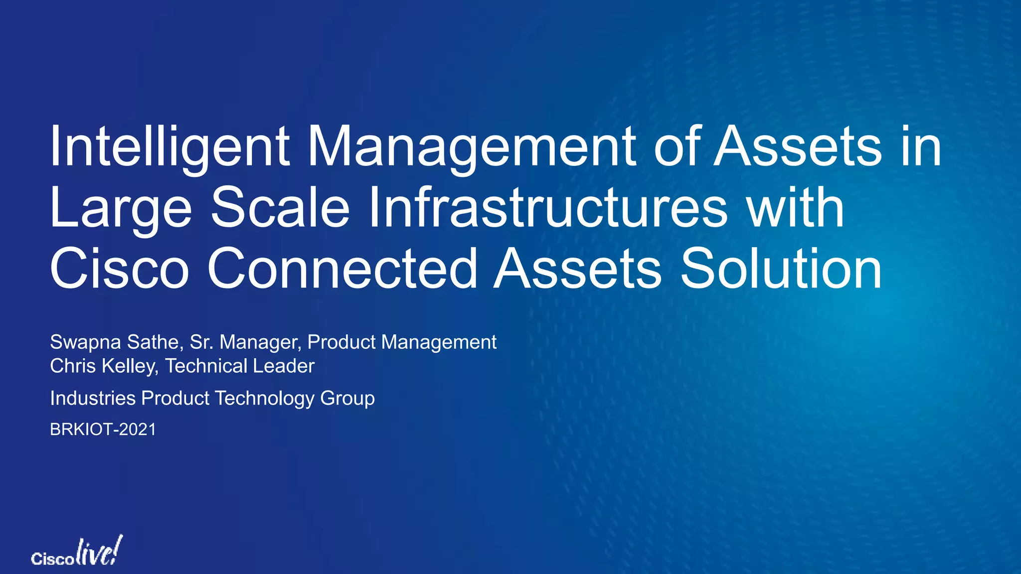 The document discusses Cisco's Connected Assets Solution aimed at intelligent asset management in large-scale infrastructures, emphasizing the impact of IoT on digitization, operational efficiency, and new business models. It highlights the journey towards IoT integration, including phases like IT and OT convergence, predictive maintenance, and energy optimization, along with demonstrating solutions for industries like manufacturing, utilities, and agriculture. The document also presents various capabilities of the Cisco Asset Manager, showcasing its applications in equipment health monitoring, environmental management, and sustainability reporting.