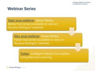 This document discusses the use of machine learning in formulating media for cell therapies, emphasizing the need for customizable solutions to enhance therapeutic efficacy and reduce lead times. It introduces Nucleus Biologics' AI platform, nb-air, which allows scientists to create optimized media formulations based on peer-reviewed research. The platform aims to provide quicker, more efficient media configurations that can significantly improve outcomes for therapy developers.