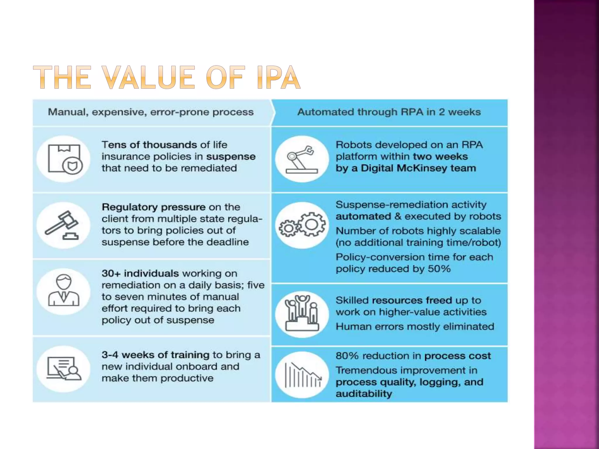 This document provides an overview of Intelligent Process Automation (IPA). IPA combines process automation, robotic process automation (RPA), and machine learning (ML) to advance businesses. It allows organizations to automate processes involving unstructured content like text and images without large training data. IPA encompasses RPA, smart workflow, machine learning, natural language generation, and cognitive agents. RPA automates routine tasks through user interfaces like software robots. Smart workflow integrates tasks performed by humans and machines. Machine learning uses algorithms to identify patterns in structured data through supervised and unsupervised learning. IPA has benefits such as improved efficiency, reduced costs, and new insights from data analytics.