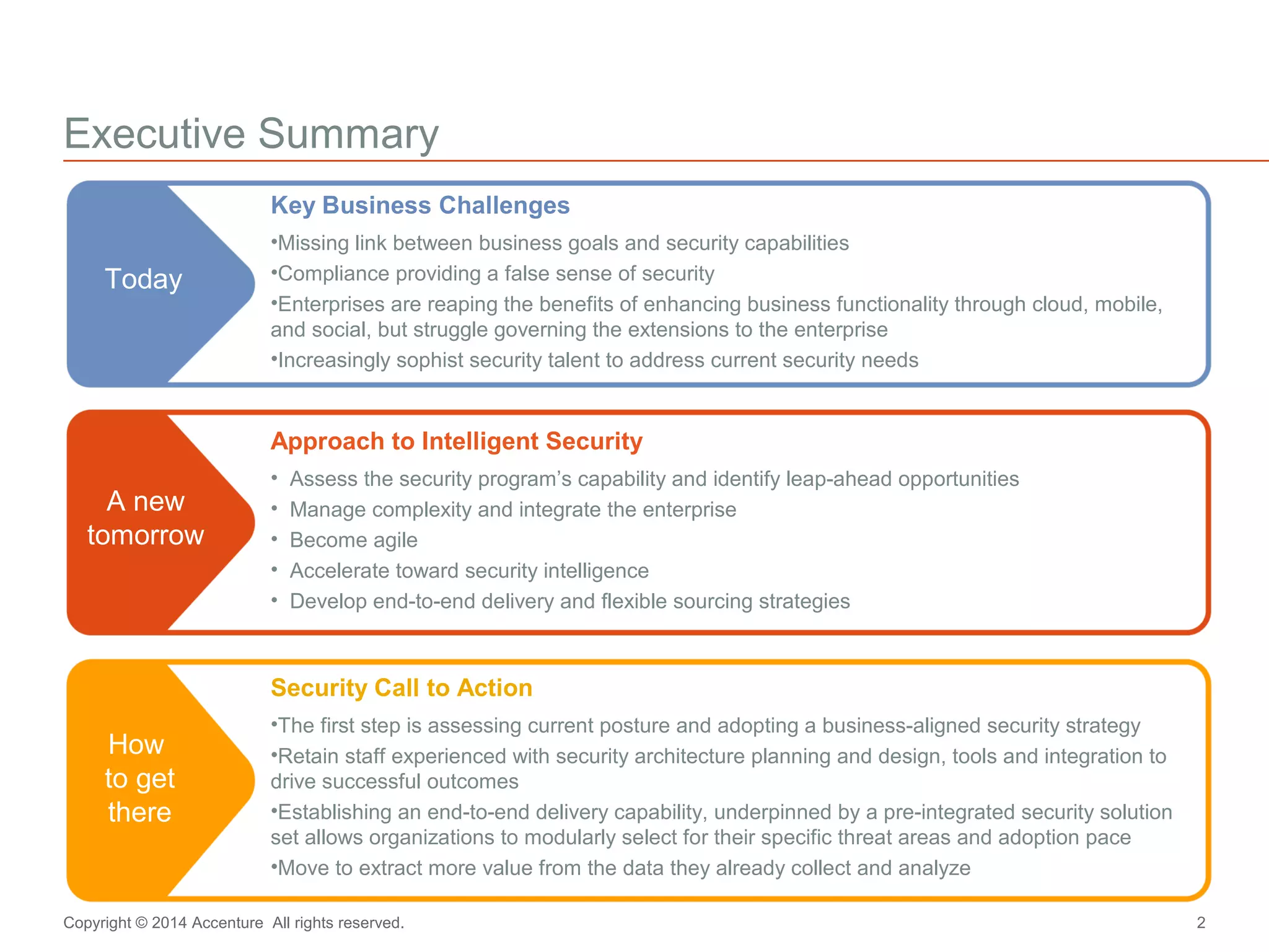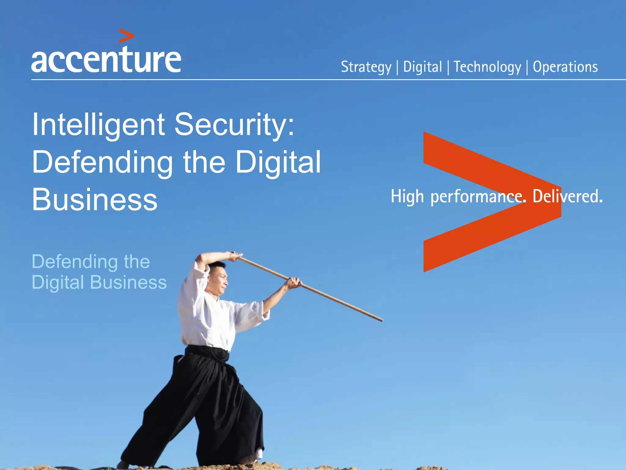 The document discusses key business challenges related to cybersecurity and proposes an approach to intelligent security. It identifies challenges such as a missing link between business goals and security capabilities, difficulties governing extensions to the enterprise like cloud and mobile, and keeping up with persistent threats. The proposed approach involves assessing security capabilities, managing complexity through enterprise integration, becoming agile, accelerating toward security intelligence through threat understanding and detection, and developing end-to-end delivery strategies. The first step is adopting a business-aligned security strategy by assessing the current security posture.