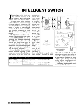 This intelligent switch circuit enables an emergency light system to automatically switch on during a power outage. It detects a power failure using a transformer, rectifier, and capacitor, which causes a relay to energize. A photo transistor and Darlington pair detect darkness and complete the battery supply path, energizing another relay to turn on the lights only when both power is out and it is dark. The operation is summarized in a table showing that the switch turns on only when mains power is absent and it is dark, otherwise it remains off.