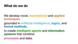 The document discusses advanced techniques in process mining using intelligent systems grounded in artificial intelligence and formal methods. It highlights the importance of data-driven decision-making in business processes and the challenges of connecting management with operational reality. The role of event logs, models, and flexibility in process management are emphasized, along with a growing market for process mining solutions.
