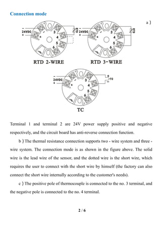 This document summarizes an intelligent temperature transmitter module. It measures temperature using thermocouples and resistance temperature detectors, and transmits the temperature readings via a 4-20mA current loop. It can be configured using a computer or mobile phone application to set parameters like temperature limits. The module is powered by 12-35VDC and has inputs for various sensor types, precision of 0.1-0.2% depending on sensor, and an operating temperature range of -30-80°C.