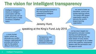 Jeremy Hunt advocates for "intelligent transparency" in the healthcare system, which involves an open conversation with the public about improving health. Intelligent transparency unleashes self-directed improvement and allows for true devolution of power through transparency of outcomes. It fosters a learning culture where doctors, nurses and managers are empowered to constantly improve care for patients. The goal of intelligent transparency is to engage the public in their health, support informed choice for patients, improve safety and quality of care, and create a more patient-centered system. Several government initiatives aim to achieve intelligent transparency through making quality and performance data publicly available and accessible online via sites like "My NHS."