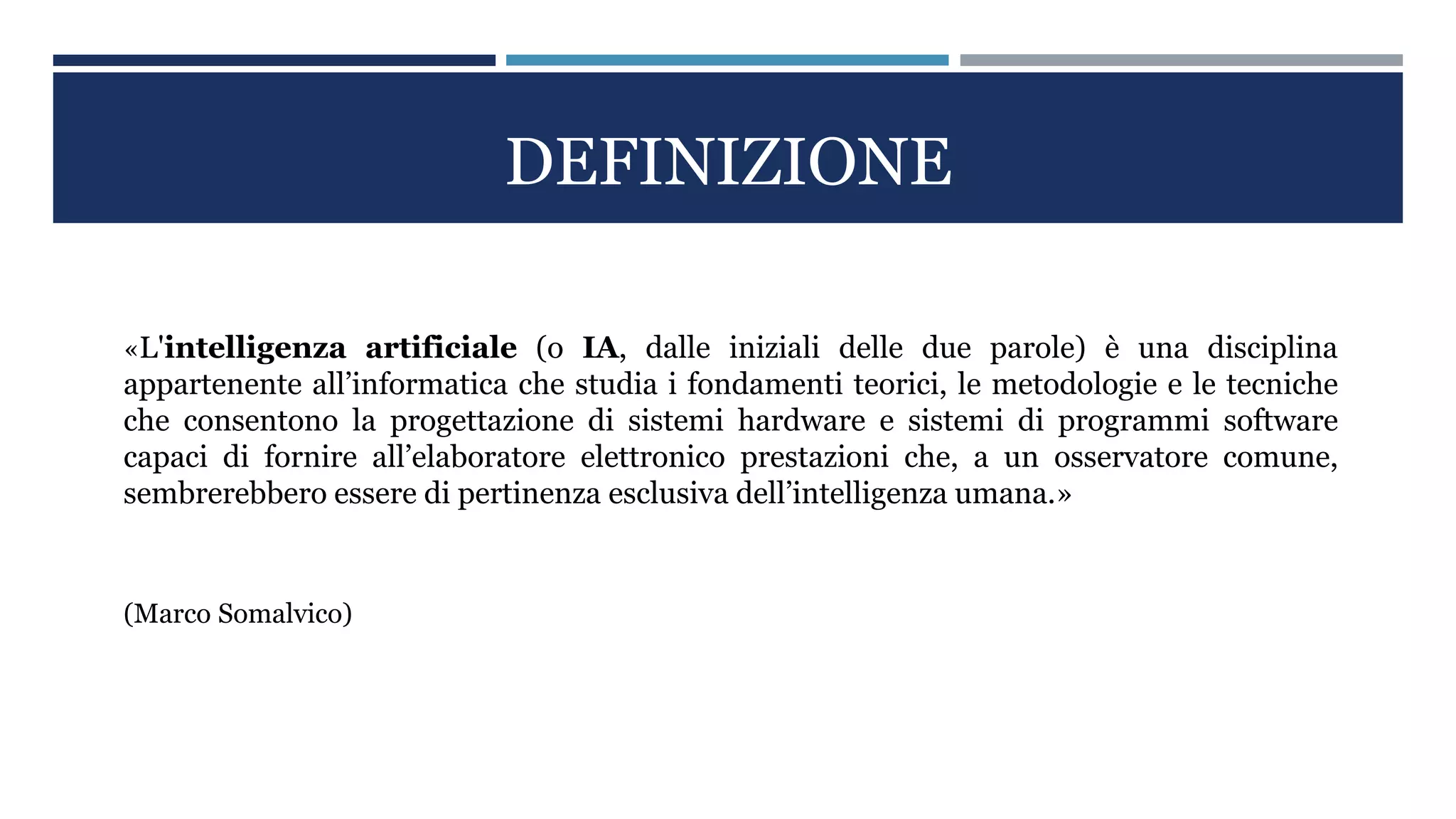 L'intelligenza artificiale (IA) è una disciplina informatica che studia come progettare sistemi capaci di emulare l'intelligenza umana. Essa si suddivide in IA debole, che simula comportamenti umani senza eguagliarli, e IA forte, che mira a creare macchine con capacità cognitive indistinguibili da quelle umane. Applicazioni pratiche dell'IA includono il riconoscimento del linguaggio, veicoli autonomi e domotica, garantendo sicurezza e efficienza energetica.