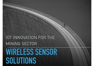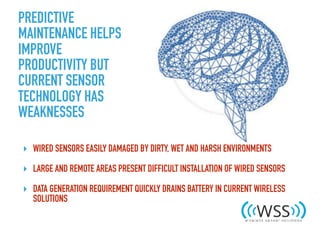 This document summarizes a wireless sensor solution called Intellys that is designed for predictive maintenance in mining environments. Intellys uses vibration-powered energy harvesting and ultra-low power design to allow perpetual wireless operation of rugged sensors in harsh conditions. This overcomes limitations of wired sensors being damaged and wireless sensors quickly draining batteries. Intellys sensors can reliably generate high sample rate data and are configurable for specific applications. The solution is presented as reducing maintenance costs by up to 70% and downtime by 50% through predictive maintenance of mining equipment.