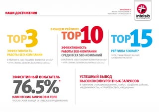Компания Intelsib предлагает услуги по поисковому продвижению и контекстной рекламе, гарантируя попадание сайтов клиентов в топ-10 поисковых систем в течение 3 месяцев. С высоким уровнем обслуживания и профессиональной команды, компании успешно удалось продвинуть более 300 проектов, основываясь на уникальных технологиях и аналитике. Intelsib активно сотрудничает с клиентами из различных регионов России и предлагает оплату по факту результата продвижения.