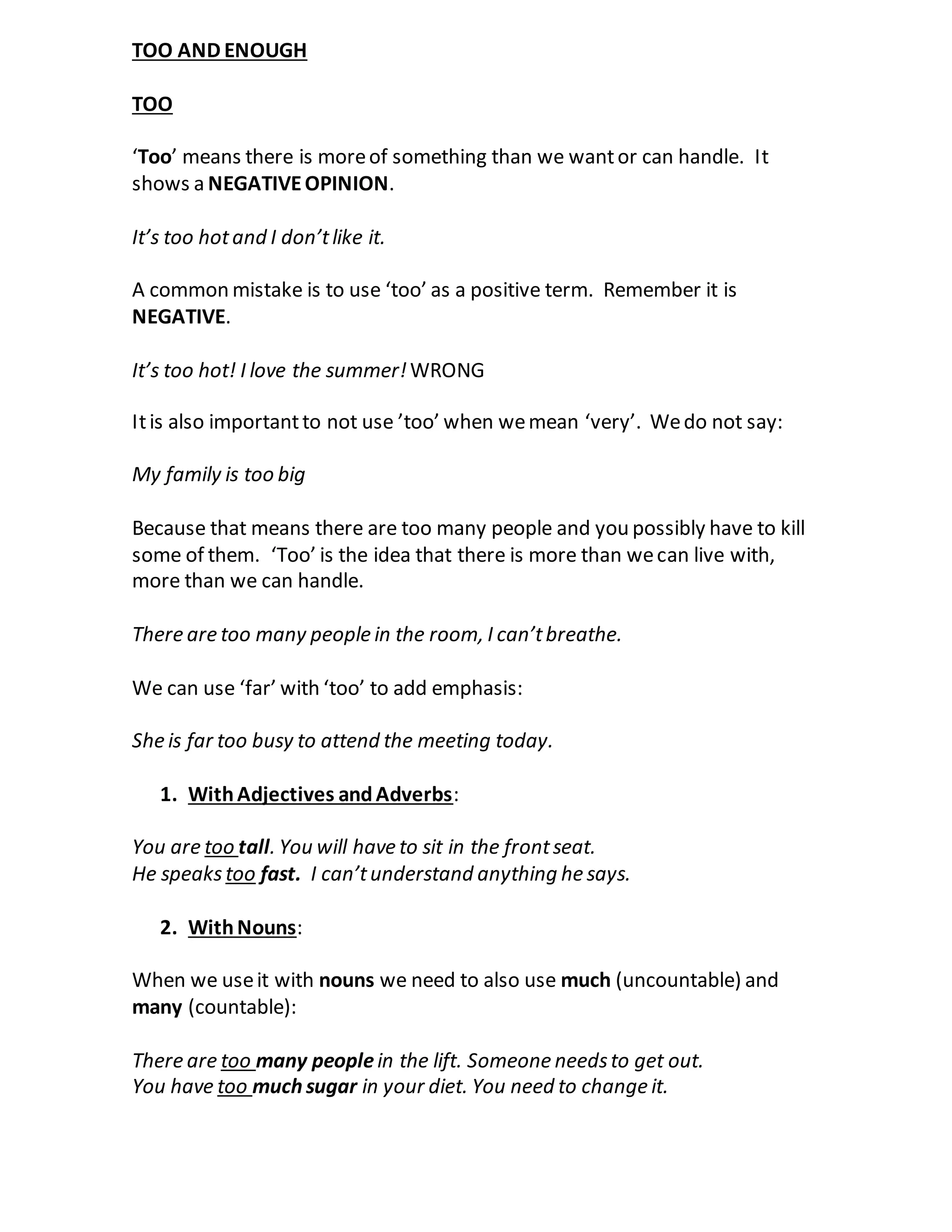 This document provides definitions and examples for the terms "too" and "enough". "Too" means there is more of something than desired and expresses a negative opinion. It is incorrect to use "too" in a positive sense. "Enough" means having what is needed or sufficient. The document outlines proper usage of "too" and "enough" with nouns, adjectives, verbs, and in constructions with "to + verb". Examples are given to illustrate appropriate uses in context.