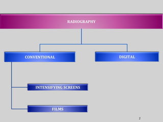 The document discusses x-ray intensifying screens and film. Intensifying screens convert x-ray energy into visible light to reduce patient dose and exposure time. They contain a phosphor layer that converts x-ray photons into many light photons. Film is light sensitive and coated with silver halide grains that form a latent image when exposed. The image is developed chemically to produce a blackened density that is measured and related to exposure on a characteristic curve. Proper storage protects the film to maintain image quality.