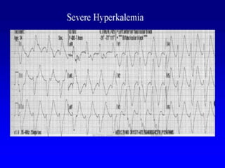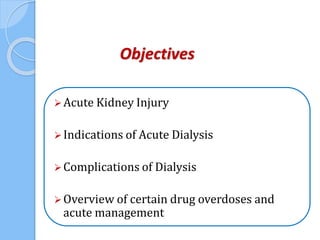 This document provides an overview of intensive care nephrology, including acute kidney injury (AKI), indications for acute dialysis, complications of dialysis, and management of certain drug overdoses. It defines AKI as an acute decrease in glomerular filtration rate (GFR) and loss of small solute clearance. Staging criteria for AKI like RIFLE are discussed. Biomarkers for early detection of AKI like neutrophil gelatinase-associated lipocalin (NGAL) and cystatin C are presented. Indications for renal replacement therapy in AKI, management of hyperkalemia, and use of bicarbonate, insulin, and salbutamol for hyperkal