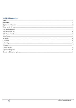 The intensive care unit (ICU) provides intensive treatment for critically ill patients. Common equipment in the ICU includes ventilators, cardiac monitors, IV lines, and other advanced medical equipment and resources not found elsewhere in the hospital. ICUs are staffed by highly trained doctors and nurses who care for patients with severe illnesses or injuries requiring close monitoring. Specialty ICUs exist for neonatal care, pediatrics, cardiac patients, neurological patients, and more. Quality ICU care is associated with lower mortality rates and recommended nurse-to-patient ratios are lower than standard hospital floors. ICU treatment is an expensive service that accounts for a high percentage of hospital costs.