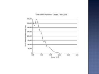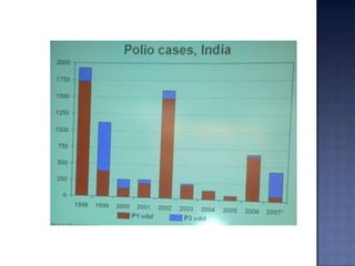The document summarizes the history of polio vaccination efforts including the development of the inactivated Salk vaccine in 1955 and the live oral Sabin vaccine in 1961. It describes the World Health Organization's goal in 1988 to eradicate polio globally by 2000 through vaccination campaigns. It provides details about India's Intensified Pulse Polio Immunization program launched in 1995 and national immunization days, highlighting challenges in reaching all children.