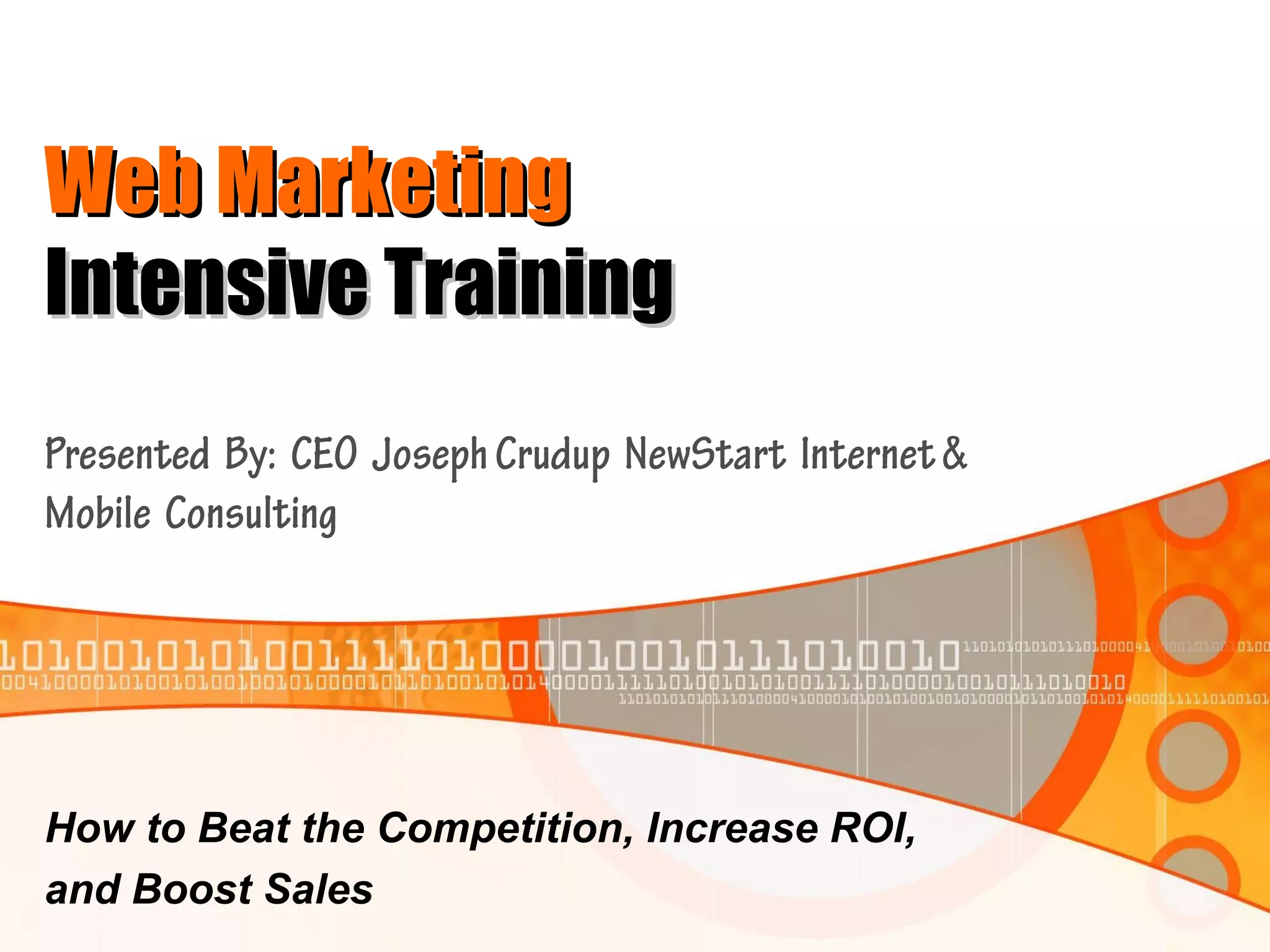 The document discusses various digital marketing strategies including optimizing websites, search engine optimization, pay-per-click advertising, social media promotion, and conversion analysis testing. It provides examples of testing email subject lines and landing pages to maximize response rates and profits. The training emphasizes the importance of testing different elements of campaigns using A/B testing and multivariate testing to determine the most effective approaches.