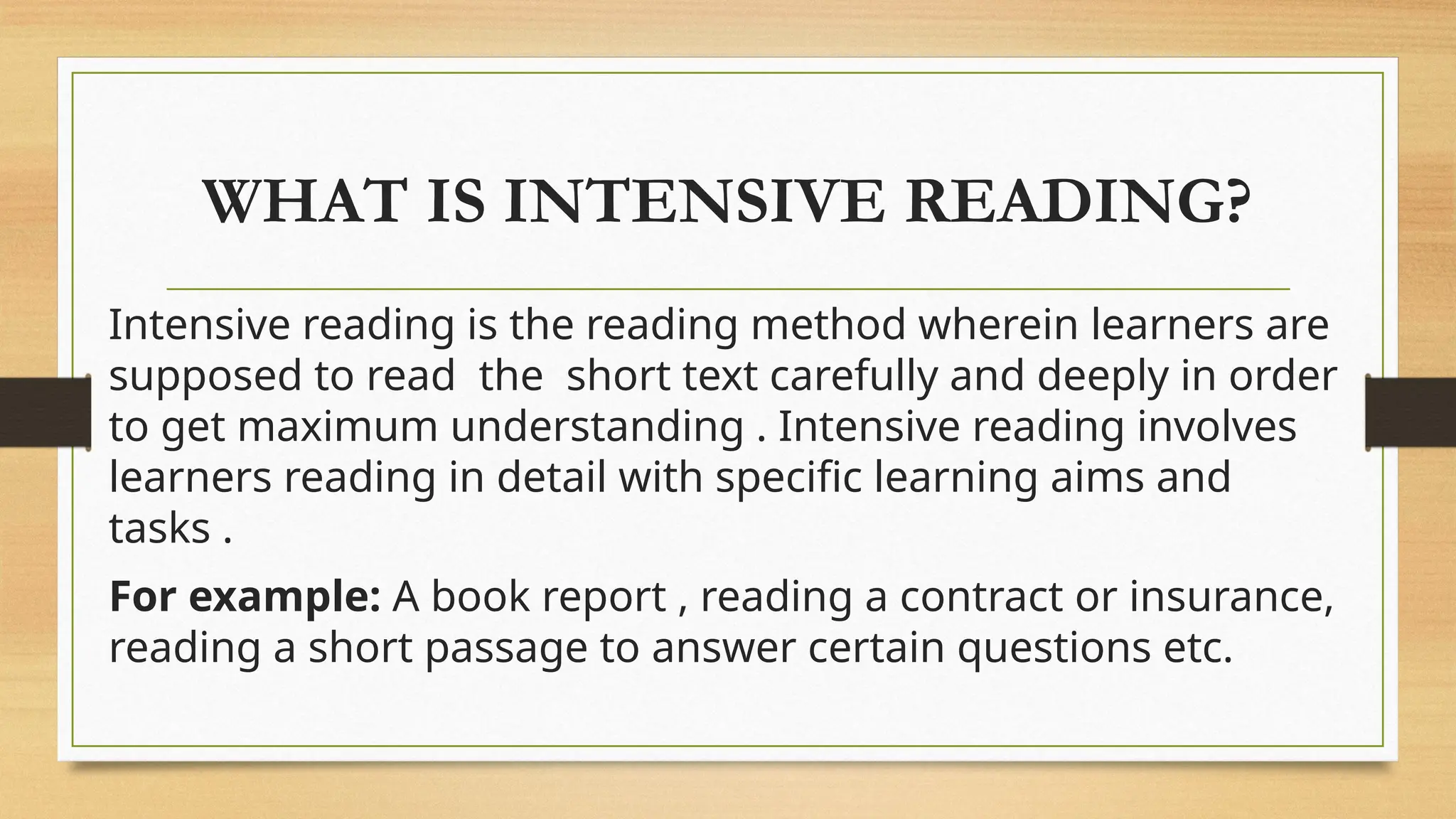 The document compares intensive and extensive reading, defining intensive reading as a focused method for deep understanding of short texts with specific tasks, while extensive reading is described as casual reading for general enjoyment and comprehension of larger texts. Intensive reading aims for 100% understanding and is often teacher-directed, whereas extensive reading fosters personal enjoyment and reader choice without specific tasks. Both methods are deemed important, serving different purposes in a reader's development.