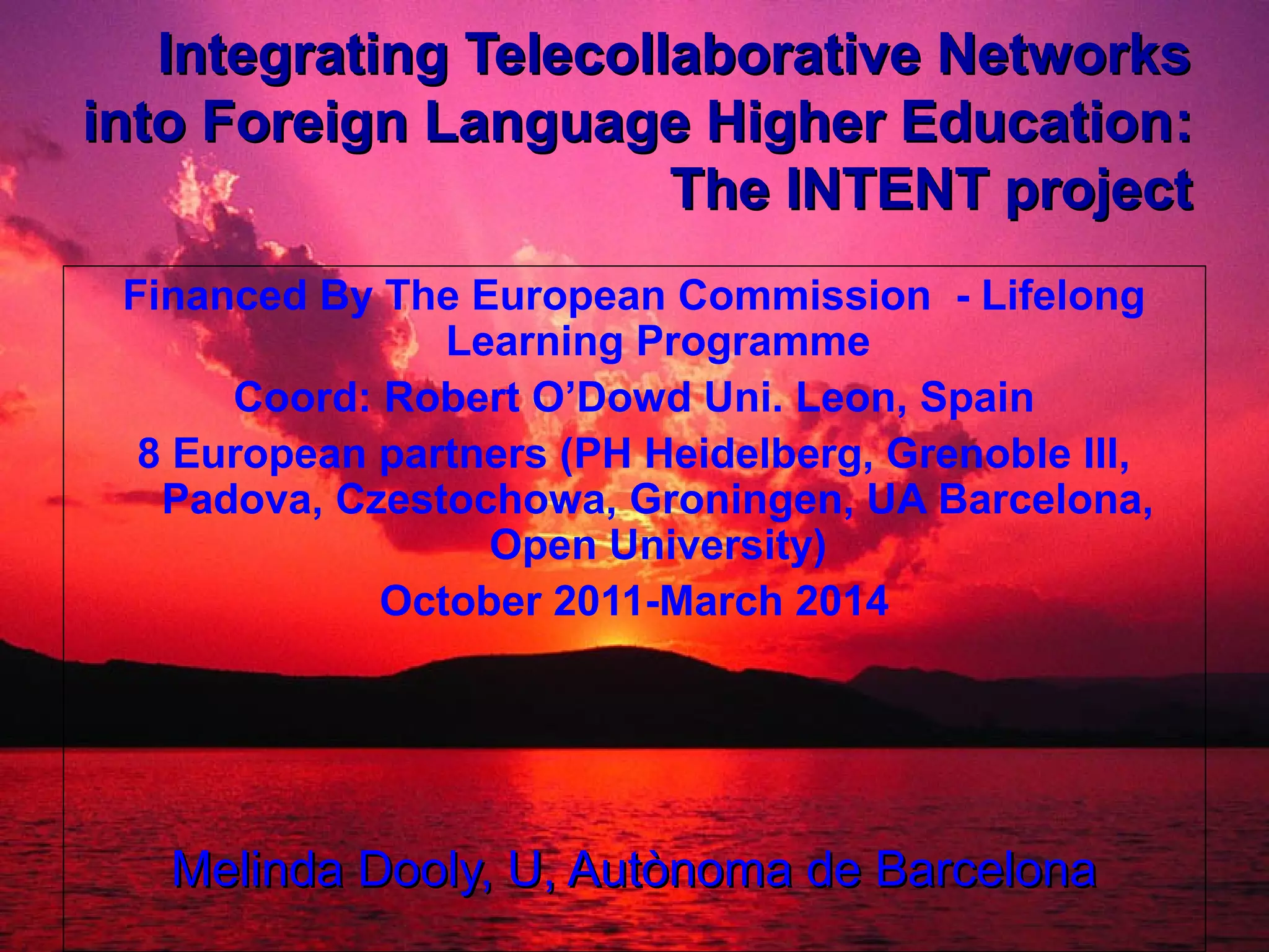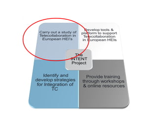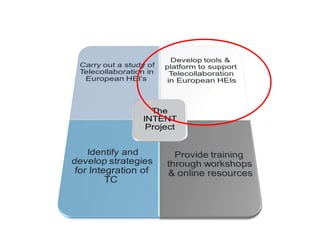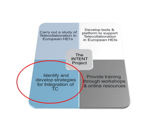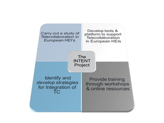 The INTENT project aims to integrate telecollaborative networks into foreign language higher education across Europe. Funded by the European Commission, the project involves 8 partner universities seeking to consolidate innovative telecollaborative practices and expand their use. By bringing language learners together online, telecollaboration provides opportunities to develop language and intercultural competences. However, its integration faces challenges like a lack of training and resources. The INTENT project aims to address these challenges through surveys, online resources, case studies, and dissemination activities to promote the wider adoption of telecollaboration.