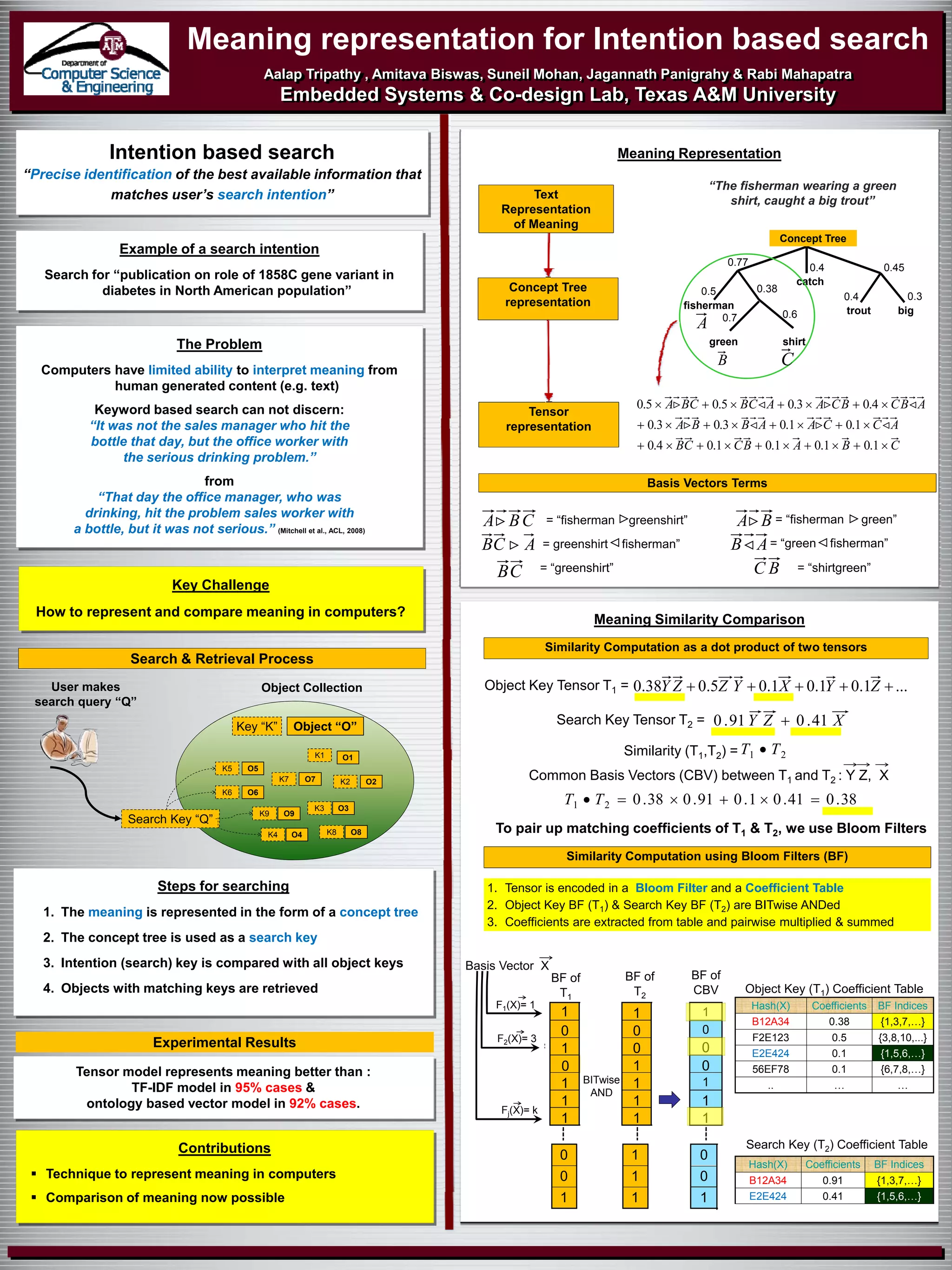 The document discusses intention-based search and how to effectively represent and compare meaning in computer systems to improve search accuracy. It highlights the limitations of keyword-based searches in interpreting human-generated content and proposes a tensor model as a more effective approach for representing meaning. Experimental results show that the tensor model outperforms traditional models like tf-idf and ontology-based vector models in most cases.