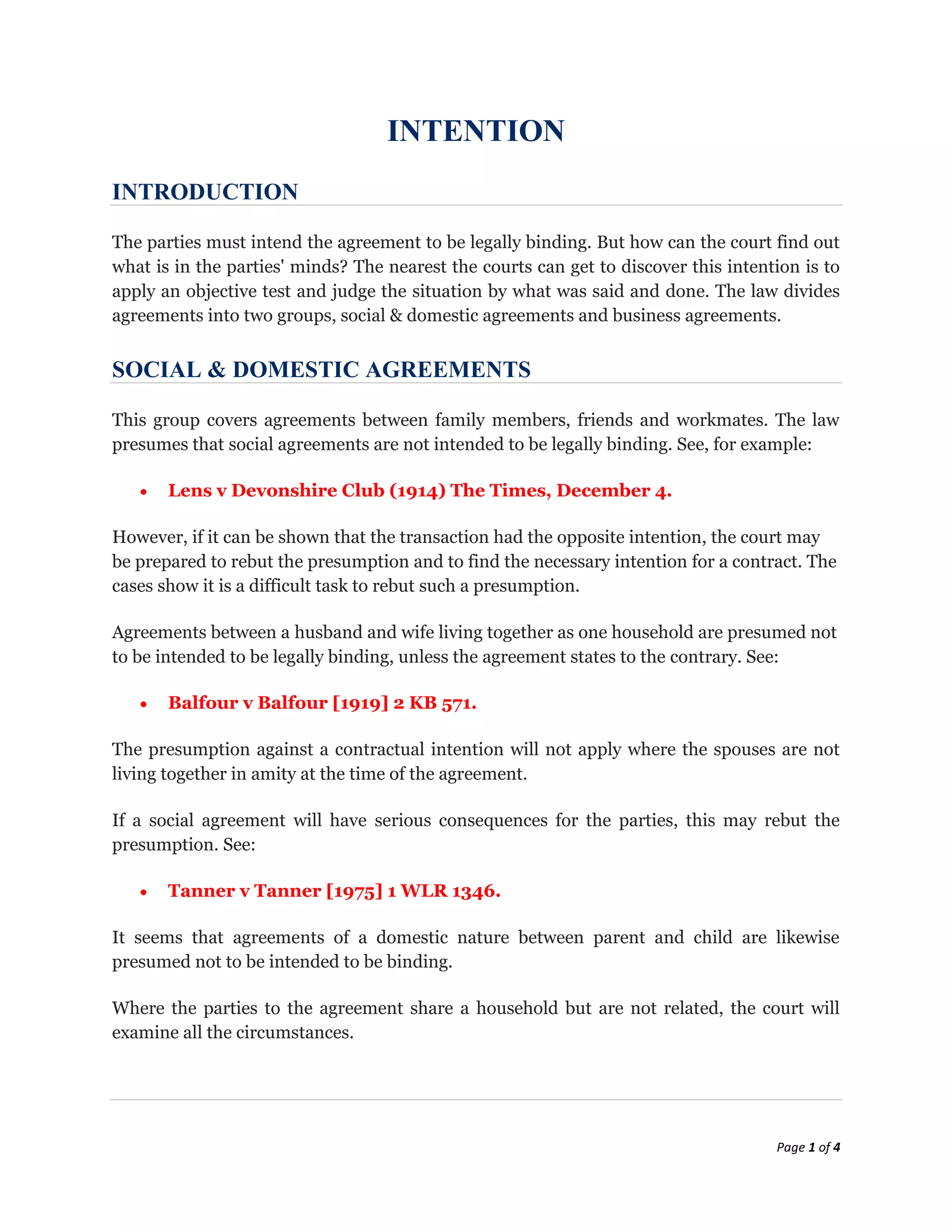 The document discusses how courts determine if parties intended an agreement to be legally binding. For social agreements between family/friends, there is a presumption they are not legally binding, but this can be rebutted. Business agreements are presumed to create legal relations. Exceptions where intent to form a contract may be lacking include vague promises, letters of comfort/intent depending on language, collective agreements unless in writing, and "free" gifts which courts have disagreed on how to classify.