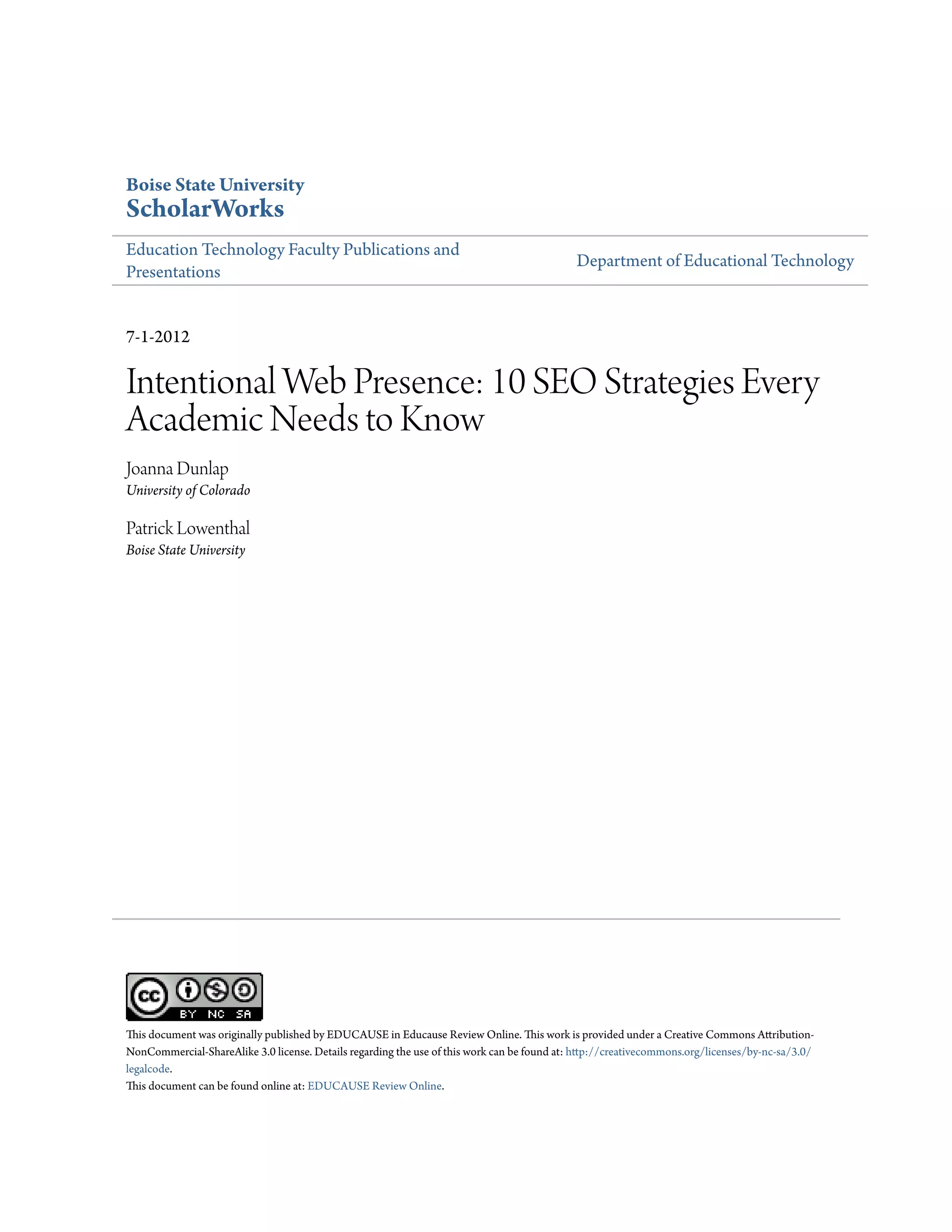 This document discusses the importance of academics intentionally building an online presence through search engine optimization (SEO) strategies. It provides 10 strategies for developing a strong web presence, including getting a professional website, regularly updating it with blogs, publications, and other materials, tracking traffic analytics, setting up Google alerts, and publishing in open-access journals. The overall argument is that if an academic's work cannot be found easily online, particularly through Google searches, then it will be irrelevant as more people conduct research primarily through online sources. Intentional SEO practices can help academics effectively share their work and establish themselves as thought leaders in their fields.