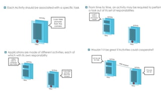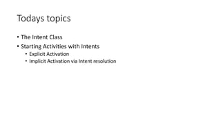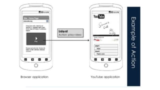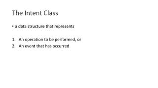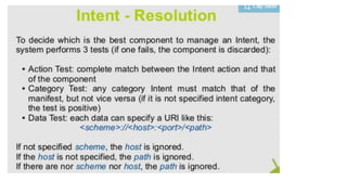The document discusses intents in Android and how they allow communication between application components. Intents are objects that specify operations or events and contain action, data, category and other metadata. They allow activities to start other activities both within and between apps to perform tasks like taking a photo, making a call, or opening maps. When an activity starts another activity via an intent without specifying the component, Android performs intent resolution to match the intent to a capable activity based on intent filters.