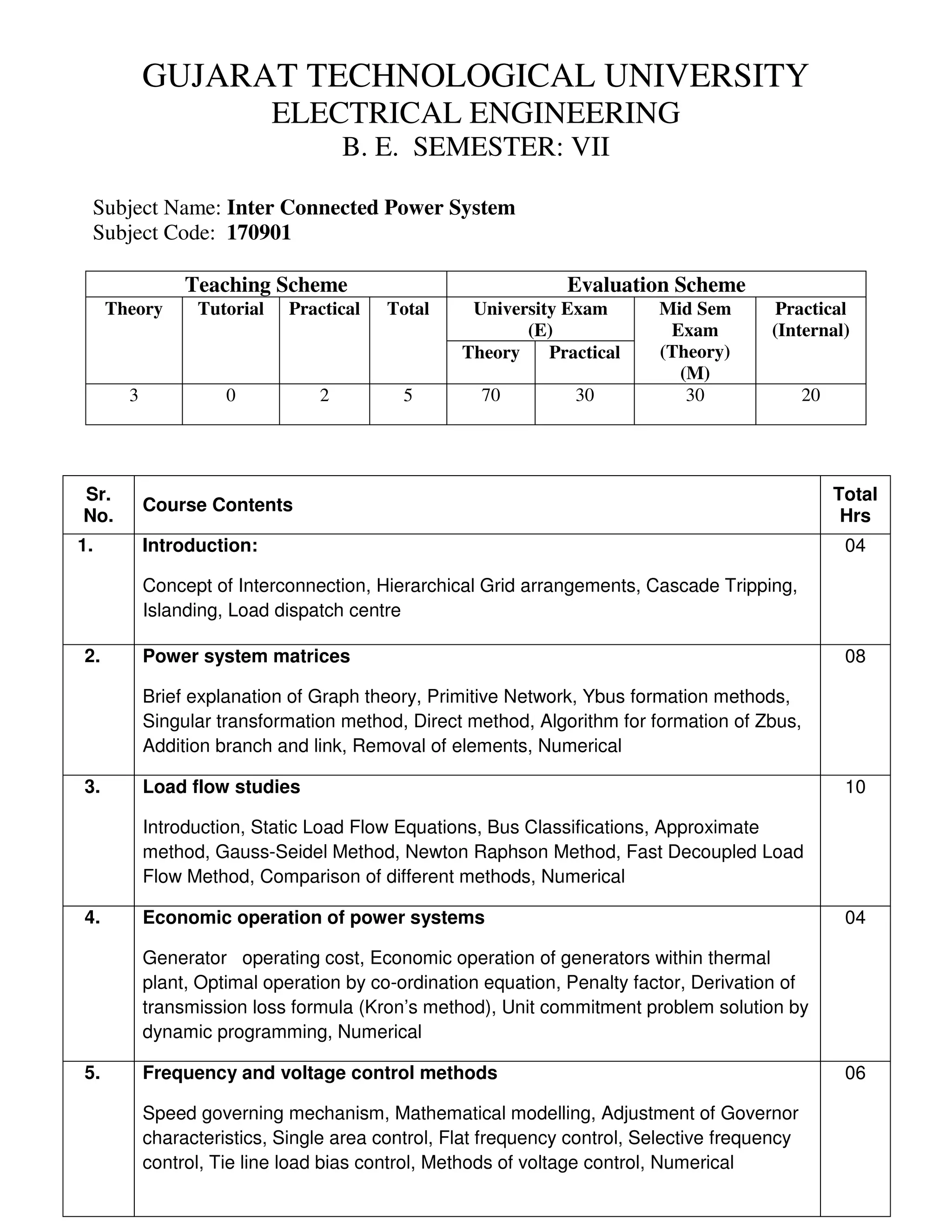 This document outlines the course contents for the subject "Inter Connected Power System" taught in the 7th semester of the B.E. in Electrical Engineering program. The course covers 6 main topics: