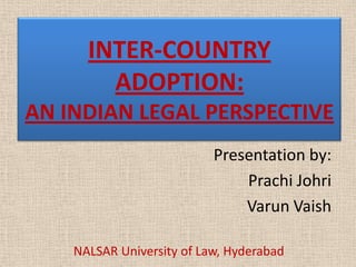The document provides an in-depth overview of inter-country adoption from an Indian legal perspective, detailing the definitions, processes, and challenges involved. It highlights the role of the Central Adoption Resource Authority (CARA) in ensuring lawful adoptions and outlines significant legal provisions and case laws that govern the practice. The presentation also addresses issues related to surrogacy in India, including the absence of comprehensive legislation and the complexities of legal parenthood in such arrangements.