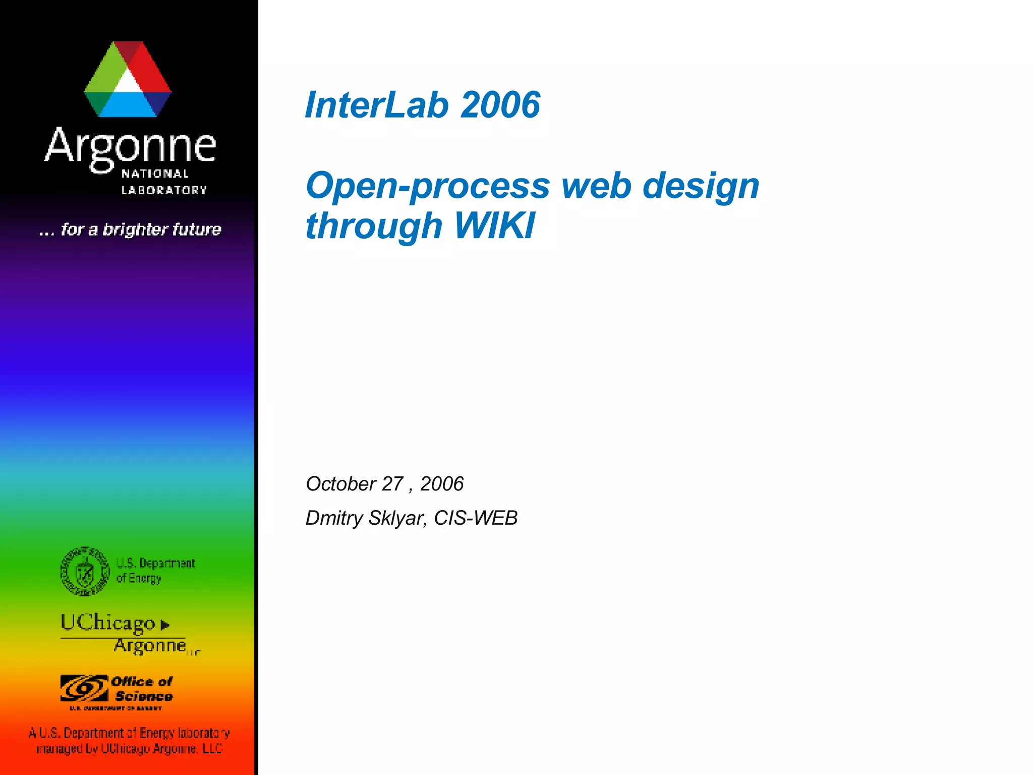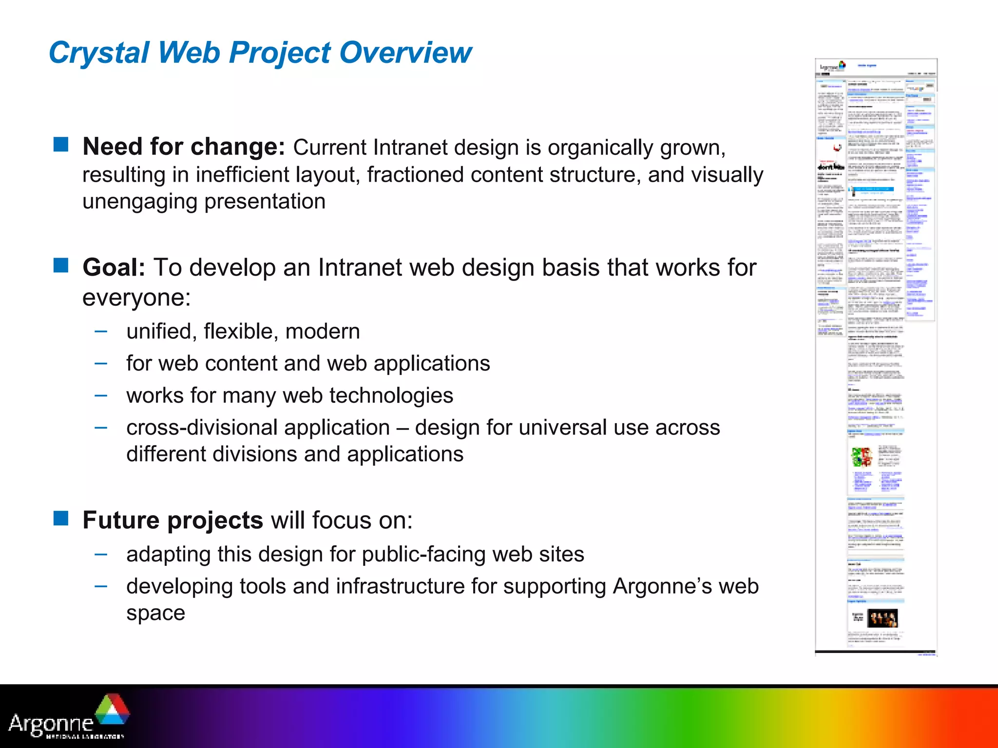 The document discusses plans to redesign the Intranet web design at Argonne National Laboratory. It aims to create a unified, flexible, and modern design that can be used across different divisions and applications. The redesign process will involve the Argonne web community providing input. Community members will be interviewed and asked to submit design concepts. The best ideas will be combined into a final design. Deliverables will include a new design template, style guide, and implementation tools to support the new standards. The open design process will use a wiki platform to enable collaborative contributions.