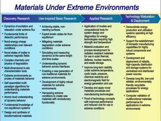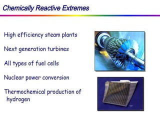 This document discusses intermetallic materials, materials for cryogenic and space environments, and evaluation of materials for extreme conditions. It provides details on intermetallic compounds, including that they are generally hard and brittle but can have good high-temperature properties. Intermetallics exhibit a mix of metallic and ceramic properties and have applications in areas like batteries, superalloys, and microelectronics. The document also introduces materials for cryogenic use, extreme environments, and metallic foams, which have gas-filled pores and can be open-celled or closed-celled.