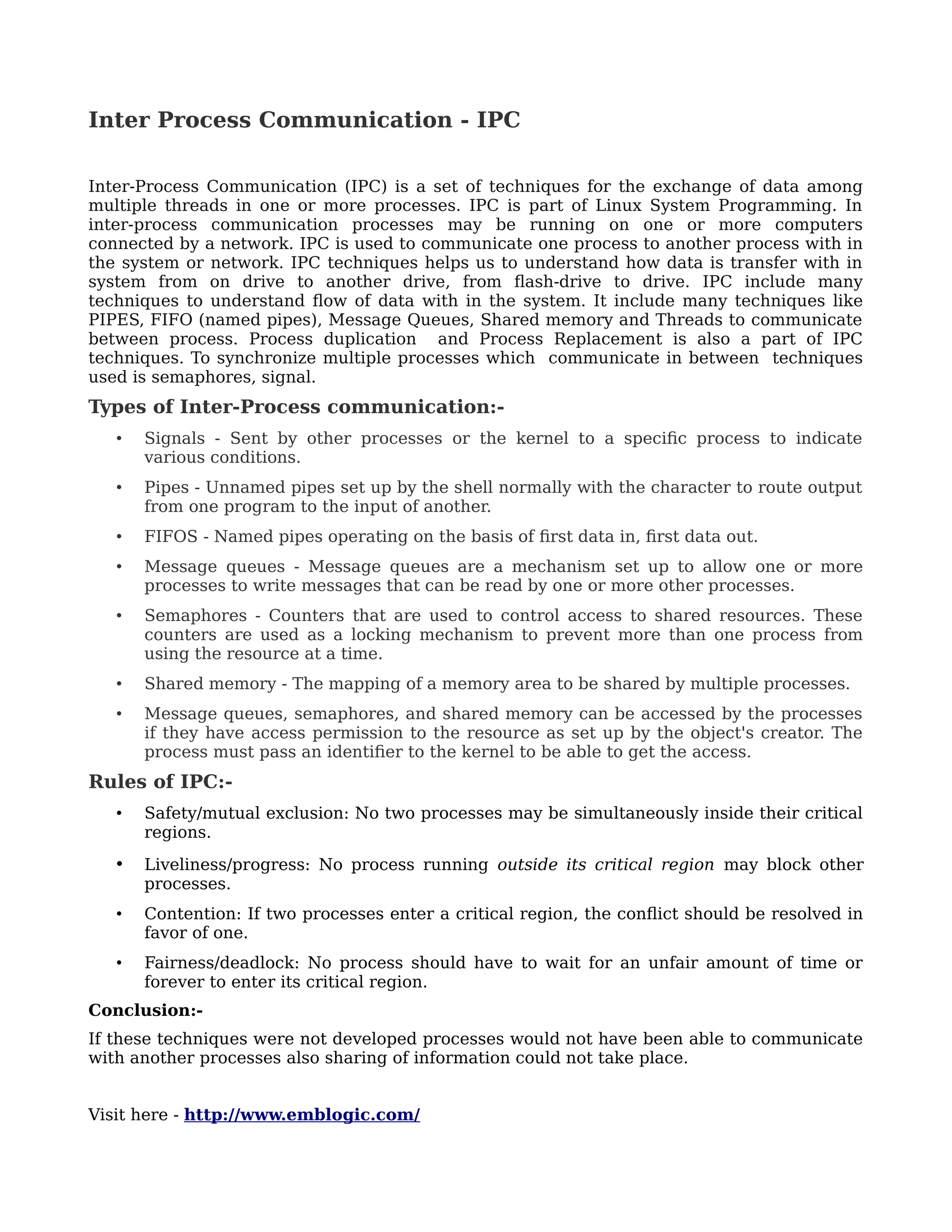 Inter-process communication (IPC) encompasses techniques for data exchange among multiple processes potentially across networks, essential in Linux system programming. It includes methods like pipes, message queues, and semaphores to enable synchronized communication and resource sharing. Rules of IPC ensure safe, fair, and efficient process interactions, highlighting its critical role in system operations.