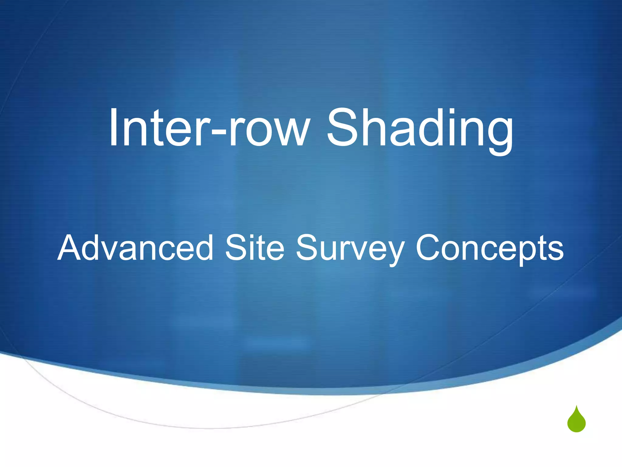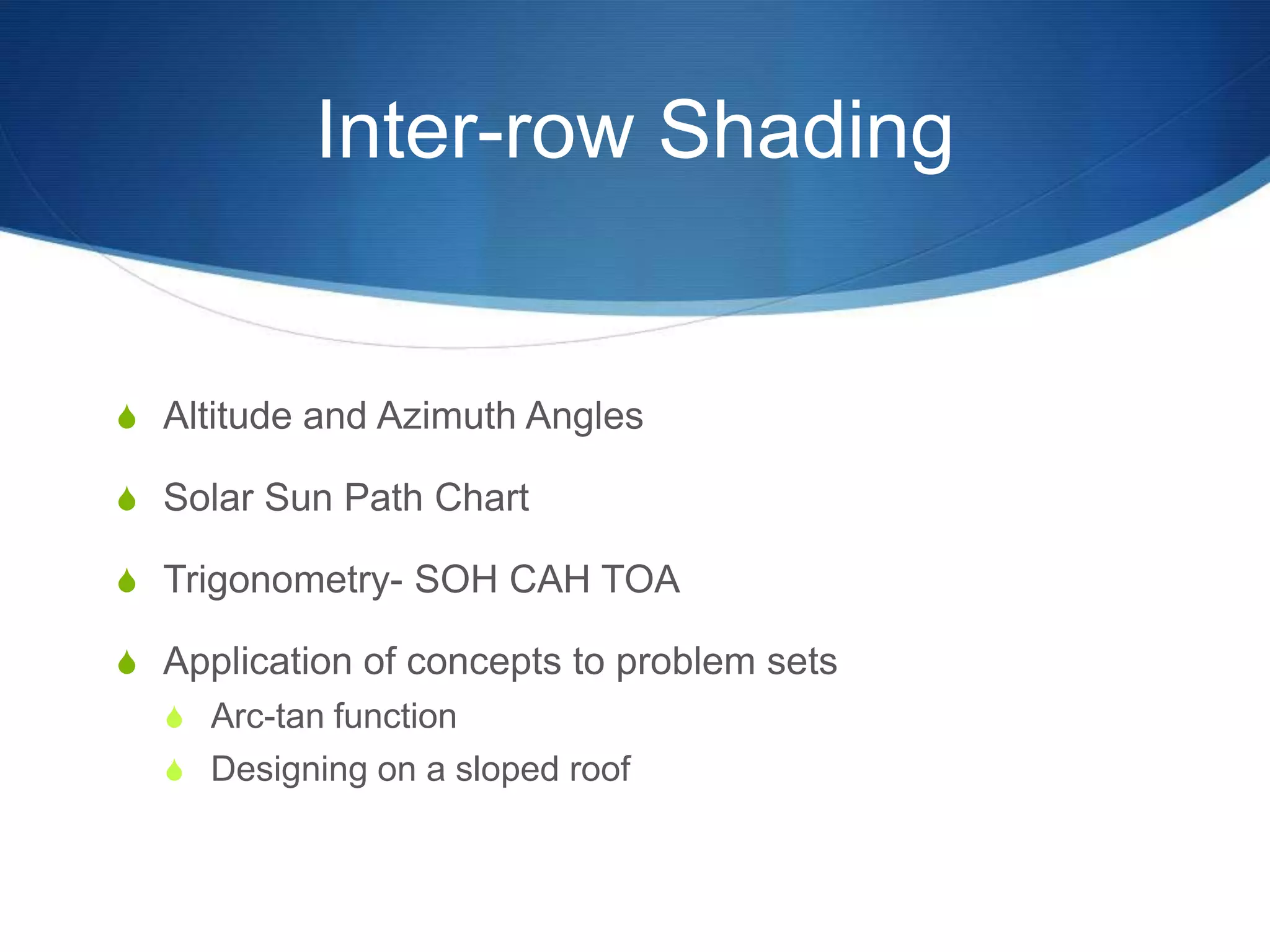 The document details advanced concepts for calculating inter-row shading in solar design, focusing on solar altitude and azimuth angles. It includes the use of trigonometric functions to determine the height and distance needed to avoid shading in solar panel installations. Additionally, practical examples illustrate how to apply these calculations for specific conditions, such as latitude and time of year.