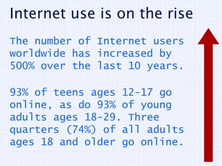 Internet use has increased 500% over the last 10 years, with 93% of teens and young adults going online regularly. The document provides tips on internet safety, including not giving out personal information to strangers online and being aware of risks like exposure to inappropriate content, cyberbullying, and contact with online predators. It advises talking to parents if feeling uncomfortable and only accepting friends known in real life.