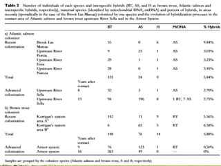 This presentation summarizes research on interspecific hybridization between Atlantic salmon and brown trout. The study examined hybridization in rivers in northern Spain where one species colonized areas inhabited by the other. When Atlantic salmon colonized brown trout areas, 5-10% of juveniles were found to be hybrids, with Atlantic salmon as the maternal species. Similarly, when brown trout colonized an area, 5-7% of juveniles were hybrids with brown trout as the maternal species. The research suggests that the colonizing female species exhibits relaxed mate choice, leading to initial hybridization. However, as the colonizing species expands, hybridization decreases or changes direction. Introgression between the species occurs at low levels and is unlikely