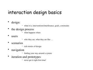 The document explores the fundamentals of interaction design, emphasizing the importance of understanding users, their goals, and the constraints in the design process. It highlights the necessity of iterative design and prototyping to refine interfaces and user interactions while maintaining user focus and effective navigation strategies. Key principles discussed include affordances, aesthetic considerations, and the implications of cultural differences in design.