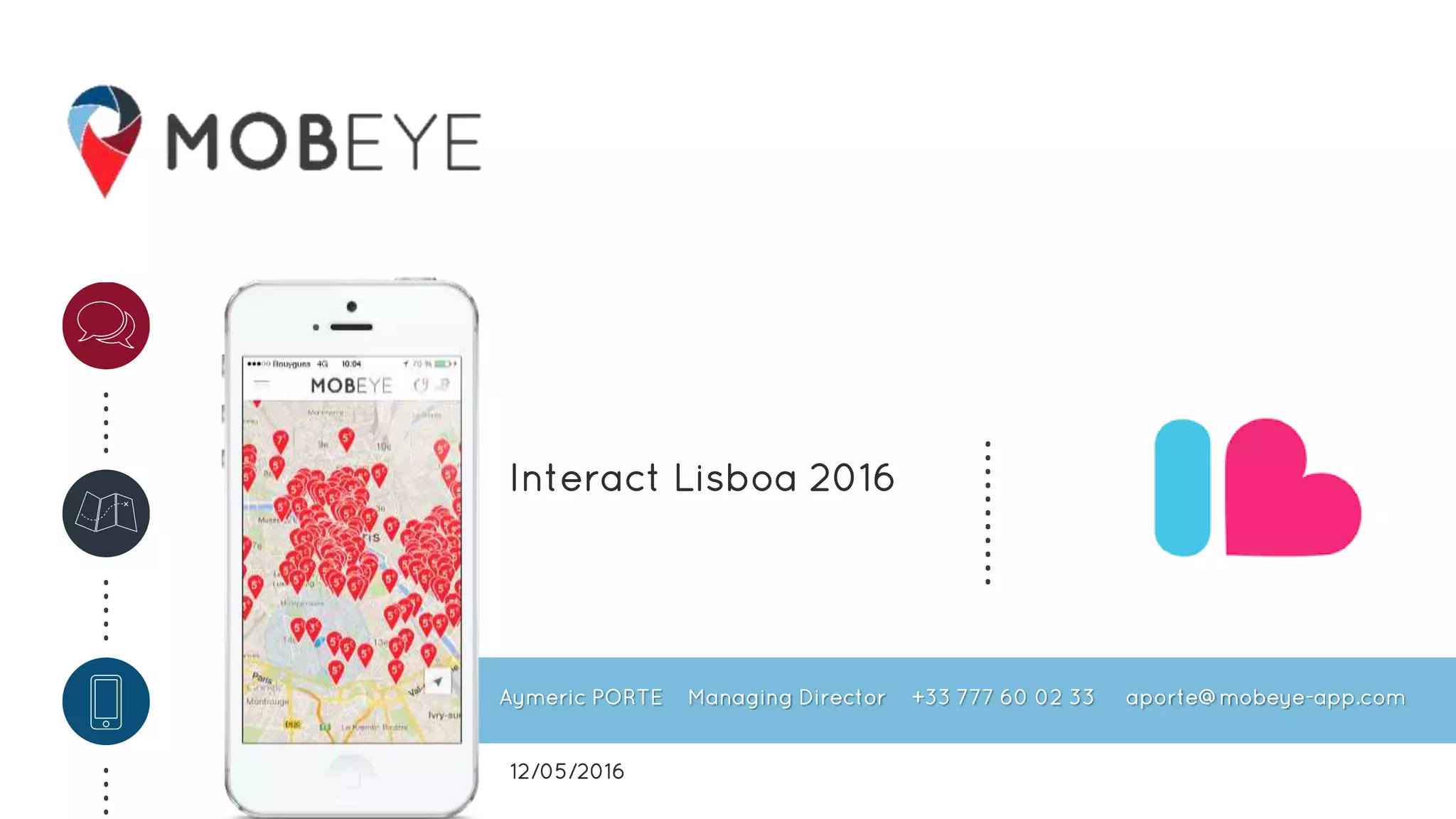 Mobeye is a company with 26 collaborators based in France, Belgium, and Spain that has raised €1.2 million. It has created a mobile app that allows FMCG companies to geolocate points of sale, take surveys and photos to verify displays and stock levels, and generate reports to improve issues where 60% of point of sale activities are not executed and 41% of products are out of stock. Mobeye's vision is to become the European leader in retail analytics by 2018 and expand globally by 2020.