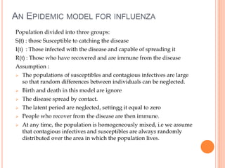 The document discusses mathematical modeling of different population dynamics, focusing on epidemic models for diseases like influenza, predator-prey interactions, competing species, and military battles. It introduces key concepts such as the basic reproduction number, population growth rates, and interaction parameters while illustrating these ideas through various differential equations. Assumptions made for each model aim to simplify complexities in real-world interactions among populations.