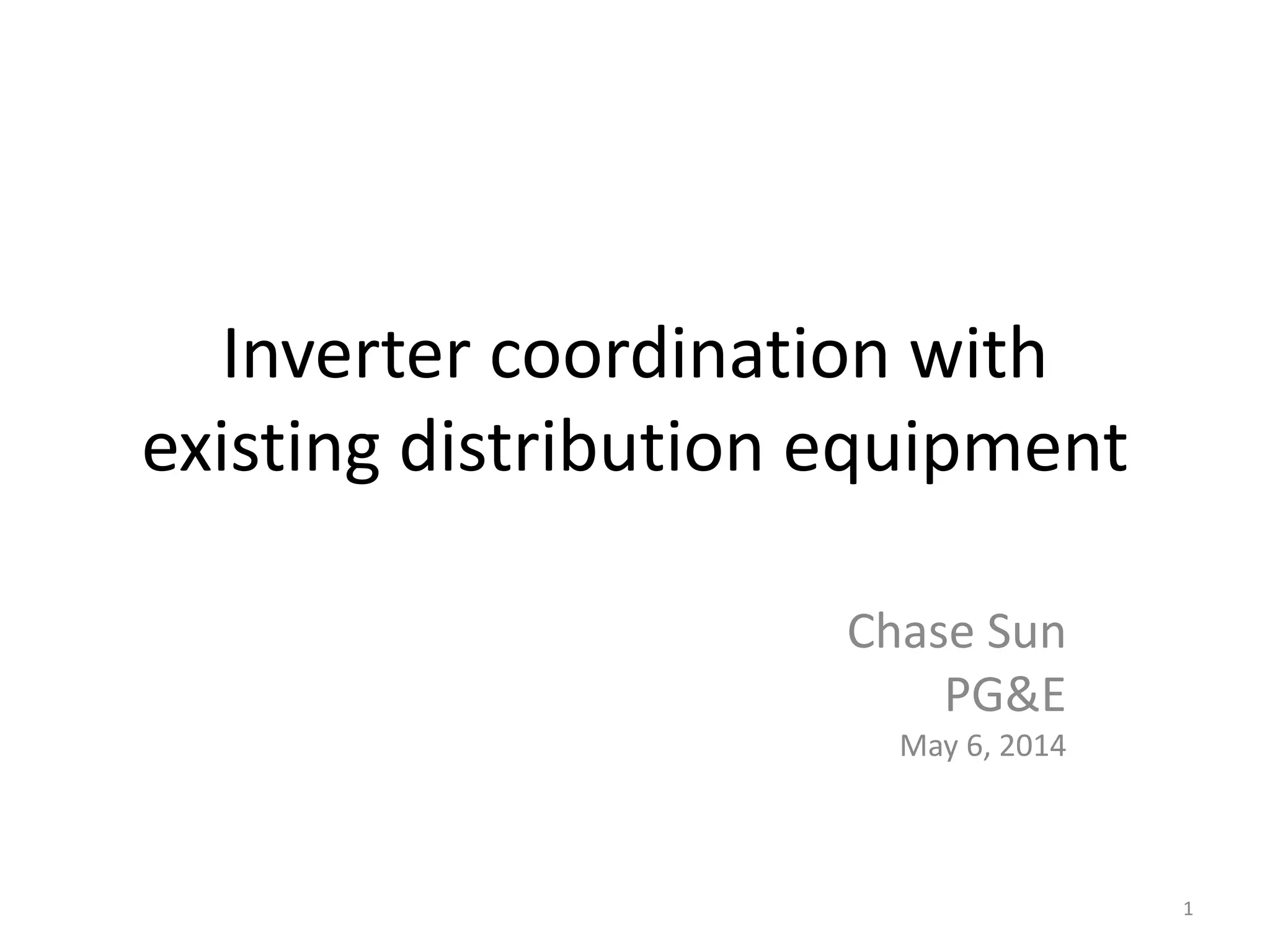 The document discusses the coordination of inverters with existing distribution equipment, focusing on protection and voltage regulation issues associated with distributed generation (DG) such as photovoltaic systems. It highlights operational challenges, such as the need for proper fault settings, voltage rise management, and the limitations of existing voltage regulators in handling intermittent DG outputs. Recommendations for mitigation include adjusting inverter settings, redesigning control circuits, and exploring advanced communication methods for voltage control to improve grid reliability and power quality.