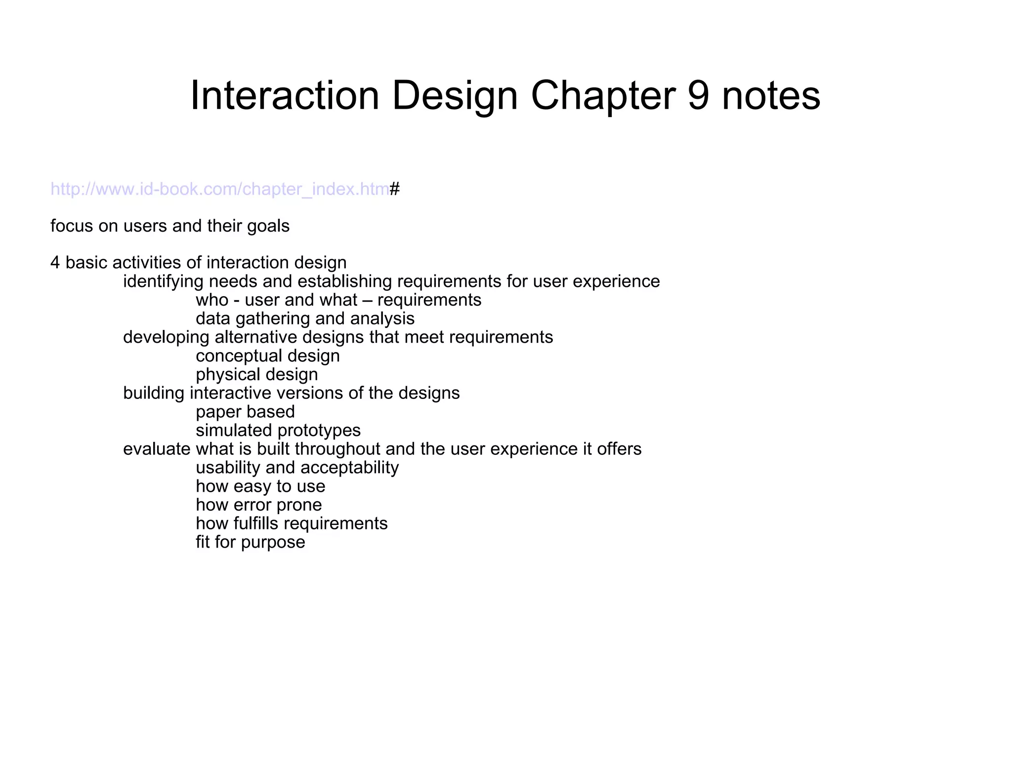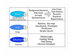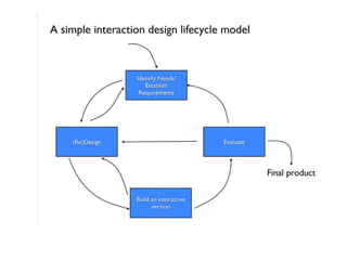 The document discusses key aspects of interaction design including identifying user needs and requirements, developing alternative designs through prototyping, and evaluating designs with users. It emphasizes the importance of involving users throughout the design process from gathering requirements to testing designs. Various methods are covered such as questionnaires, focus groups, and usability testing to understand users and get their feedback on designs. Different design processes and lifecycles are also summarized such as iterative and agile approaches.