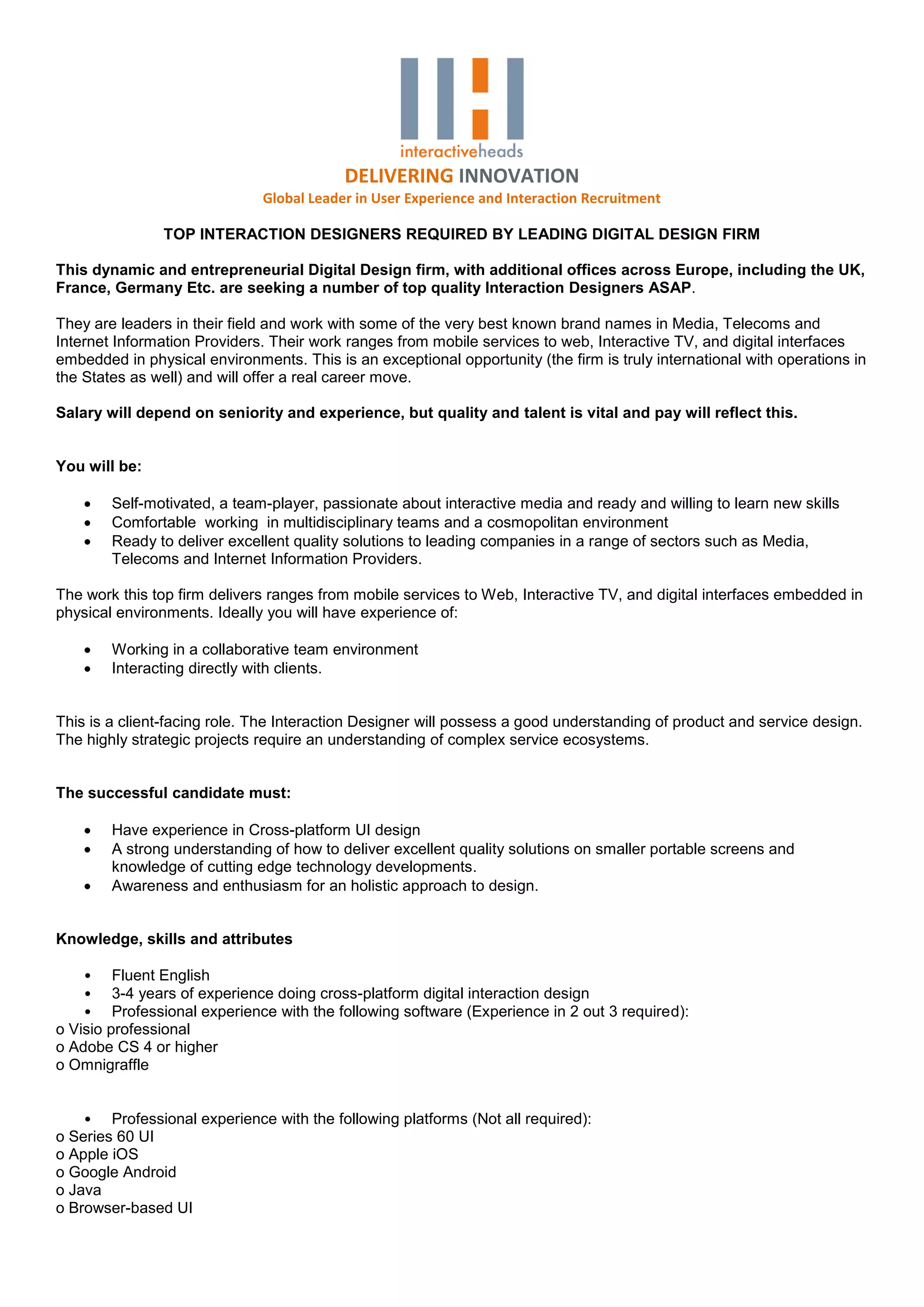 This summary provides an overview of a job posting from an international digital design firm seeking top interaction designers: