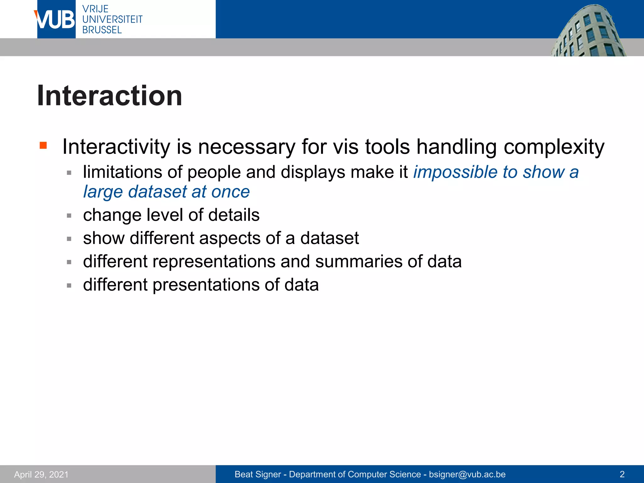 The document details methods for handling visual complexity in data visualization, highlighting the importance of interactivity and different representation techniques. It discusses major approaches such as faceting into multiple views, linking views, and embedding focus and context to improve data interpretation. Additionally, examples like bird's-eye maps, superimposed charts, and distortion techniques illustrate how to navigate large datasets effectively.