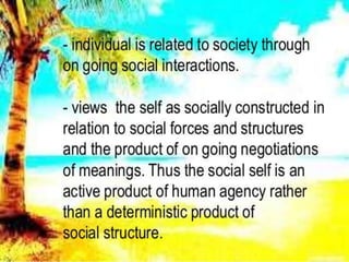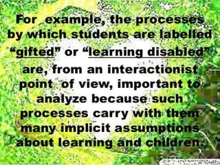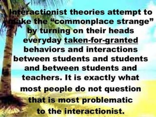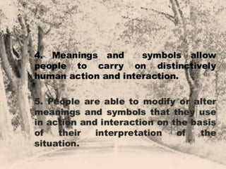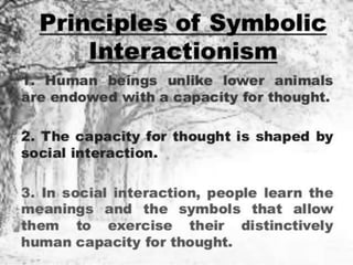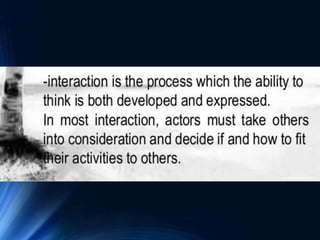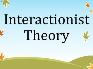 Interactionist theory views social processes as emerging from human interaction. It focuses on how people act and influence each other in face-to-face encounters and ongoing social interactions. Two key founders were George Herbert Mead and Charles Horton Cooley, who examined how individuals relate to society through interaction. Interaction can involve symbolic mental processes (symbolic interactionism) or happen without thinking (non-symbolic interactionism). A core idea is that people understand objects and themselves based on how others respond during social interactions.