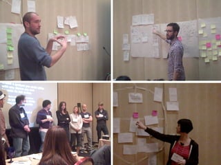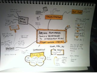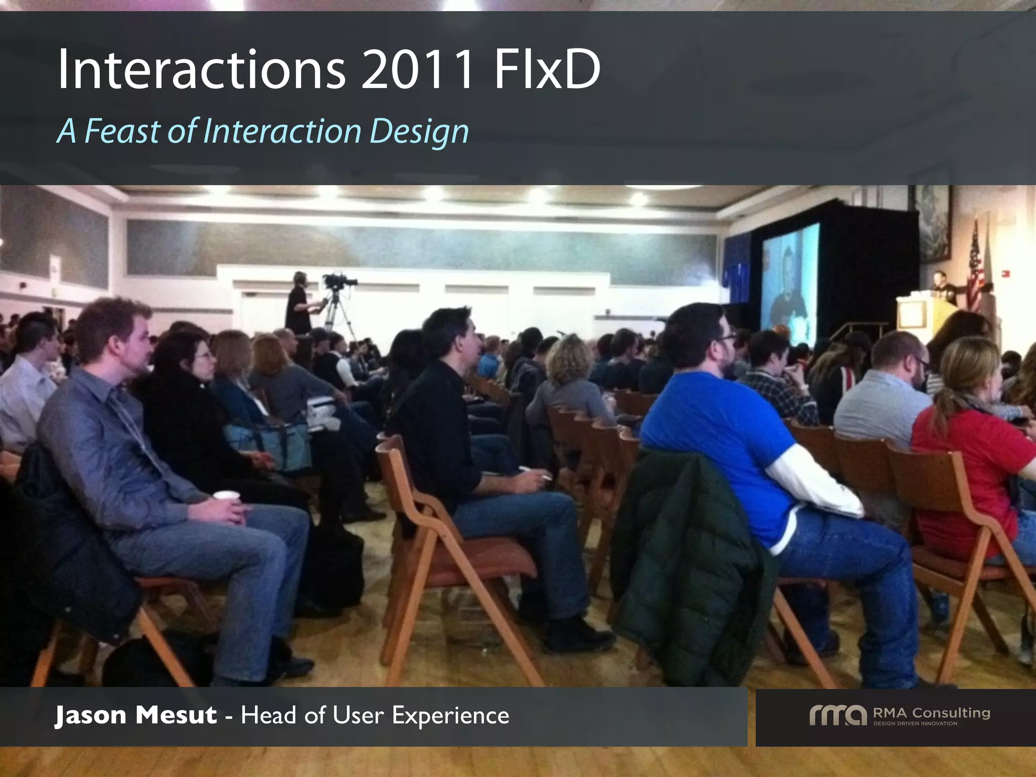 This document summarizes the Interactions 2011 conference, which brought together top interaction designers from around the world. It describes some of the workshops and presentations over the 3-day event, including sessions on self-ethnography, idea generation techniques, and the application of filmmaking tools to interaction design. Key speakers such as Bill Verplank, Lisa Strausfeld, Richard Buchanan, Brenda Laurel, and Bruce Sterling provided thought-provoking talks on topics like design fundamentals, information art, design's role in society, and the future of interactive media. Site visits were also made to design studios at Disney, Wall Street On Demand, and Crispin Porter + Bogusky.